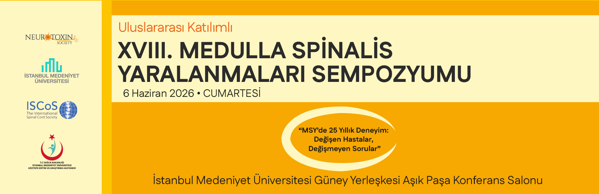 İstanbul Medeniyet Üniversitesi Tıp Fakültesi Fiziksel Tıp ve Rehabilitasyon Anabilim Dalı, Nörotoksin Derneği ve ISCoS Koruma Komitesi Başkanı olarak sizleri 6 Haziran 2026 tarihinde İstanbul Medeniyet Üniversitesi Aşıkpaşa Konferans salonunda gerçekleştirilecek olan Uluslararası Katılımlı 18.Medulla Spinalis Yaralanmaları Sempozyumu'na davet etmekten büyük mutluluk duyuyorum.